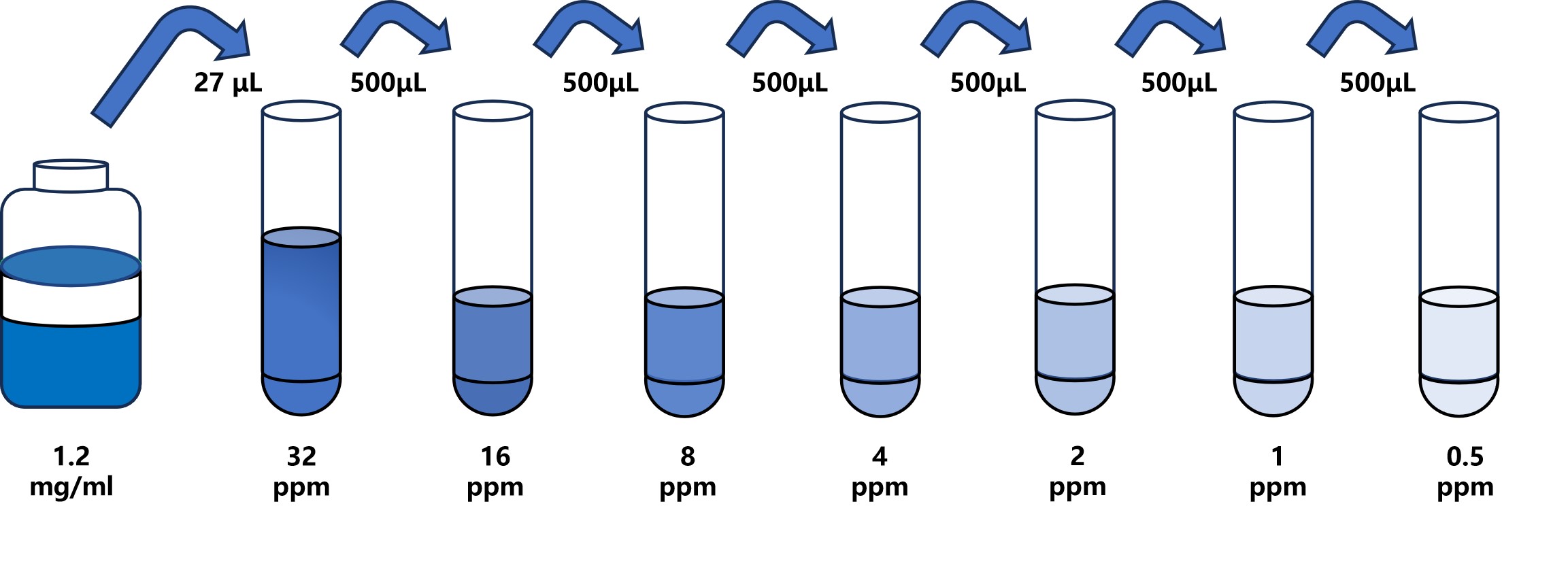 试剂盒中取出标准品,准备7个试管,先将1.2mg/mL标准品(200µL)按需吸取一定量用1×稀释液稀释至32 ppm(例:27µL的标准品母液+973µL的1×稀释液,制备得到1000μL的32 ppm浓度标准品),随后在6个试管中分别加入500μL的1×稀释液,在这6个单独的试管中将32 ppm标准品依次2倍倍比稀释至6个梯度,共配制7个浓度的标准品,依次为:32 ppm、16ppm、8ppm、4ppm、2ppm、1ppm、0.5ppm,从最高浓度标准品溶液中吸取500μL标准品到下一个试管中,轻轻吹打混匀,以此类推进行标准品的倍比稀释(如图所示),1×稀释液用作零浓度标准品(0ppm)。