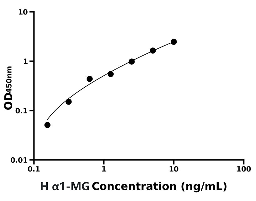 本试剂盒采用双抗体夹心法ELISA技术:将捕获抗体包被于酶标板上,捕获样品及标准品中的待测物α1-MG,清洗后,再加入生物素标记的检测抗体进行孵育后清洗,形成“捕获抗体-抗原-检测抗体”免疫复合物,随后加入链霉亲和素偶联的辣根过氧化物酶进行孵育,待孵育结束后清洗,接着加入TMB显色后,若样本中有待测物则显蓝色,加入终止液停止反应。检测过程中游离的成分均被洗去,用酶标仪在450 nm处测OD值,颜色的深浅和样品中的待测物的含量呈正比,通过绘制标准曲线计算出样本中α1-MG的浓度。