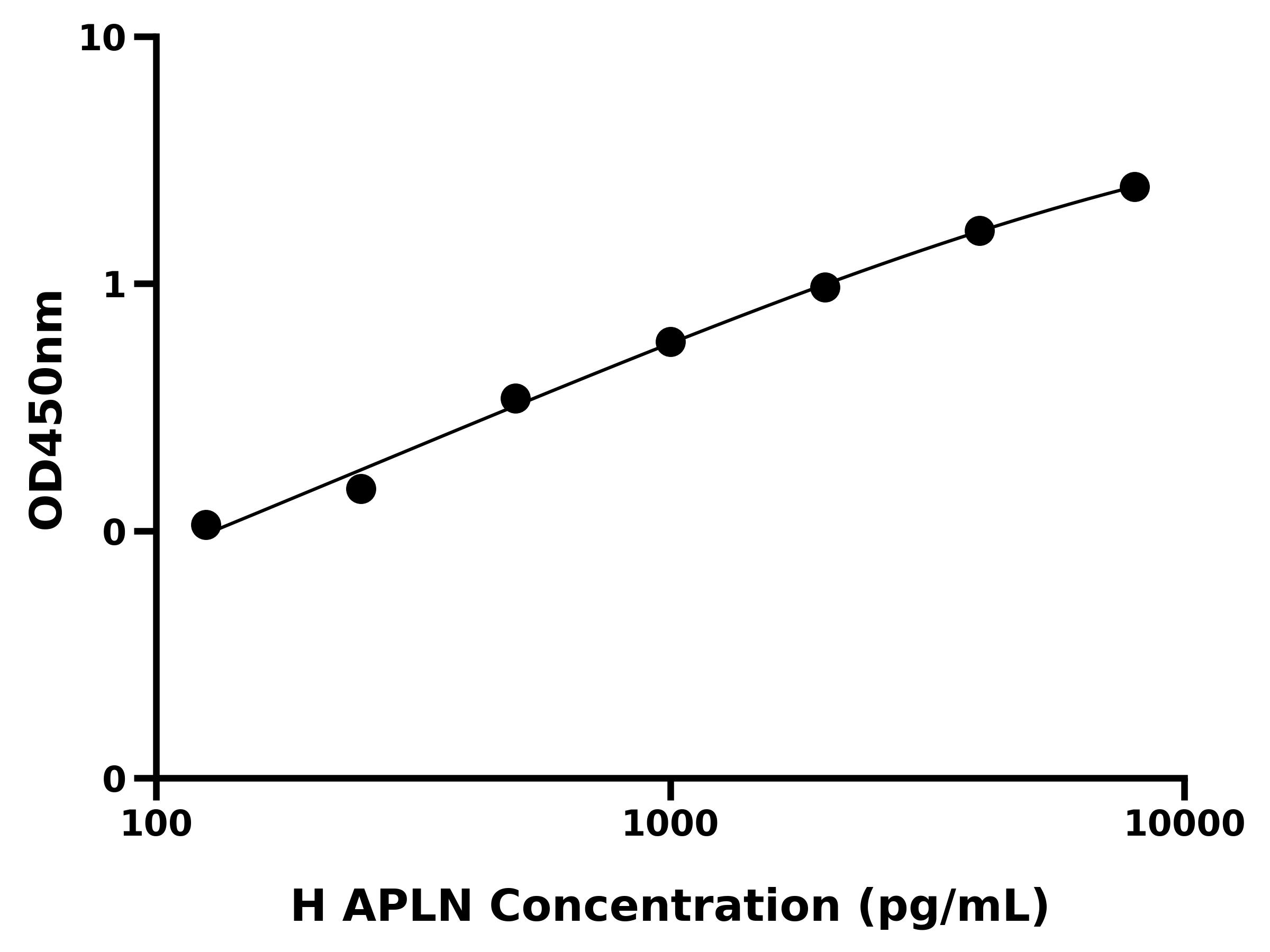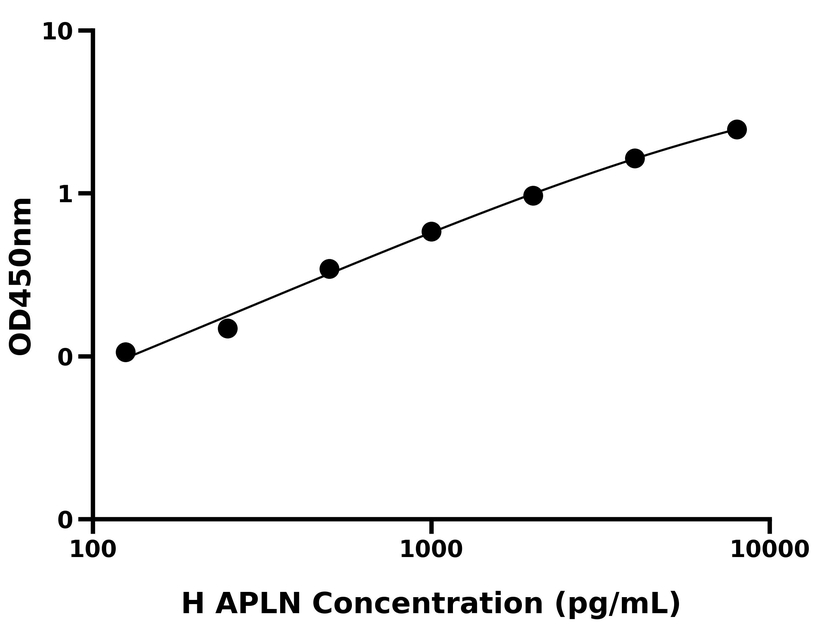 本试剂盒采用双抗体夹心法ELISA技术:将捕获抗体包被于酶标板上,捕获样品及标准品中的待测物APLN,清洗后,再加入生物素标记的检测抗体进行孵育后清洗,形成“捕获抗体-抗原-检测抗体”免疫复合物,随后加入链霉亲和素偶联的辣根过氧化物酶进行孵育,待孵育结束后清洗,接着加入TMB显色后,若样本中有待测物则显蓝色,加入终止液停止反应。检测过程中游离的成分均被洗去,用酶标仪在450 nm处测OD值,颜色的深浅和样品中的待测物的含量呈正比,通过绘制标准曲线计算出样本中APLN的浓度。