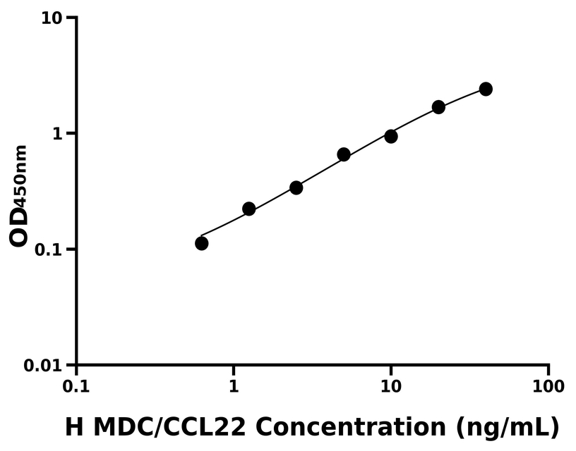本试剂盒采用双抗体夹心法ELISA技术:将捕获抗体包被于酶标板上,捕获样品及标准品中的待测物MDC/CCL22,清洗后,再加入生物素标记的检测抗体进行孵育后清洗,形成“捕获抗体-抗原-检测抗体”免疫复合物,随后加入链霉亲和素偶联的辣根过氧化物酶进行孵育,待孵育结束后清洗,接着加入TMB显色后,若样本中有待测物则显蓝色,加入终止液停止反应。检测过程中游离的成分均被洗去,用酶标仪在450 nm处测OD值,颜色的深浅和样品中的待测物的含量呈正比,通过绘制标准曲线计算出样本中MDC/CCL22的浓度。