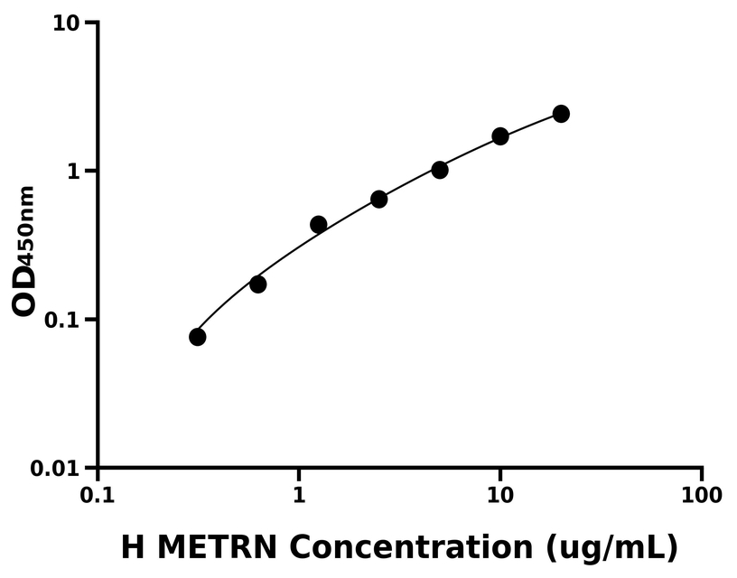 本试剂盒采用双抗体夹心法ELISA技术:将捕获抗体包被于酶标板上,捕获样品及标准品中的待测物METRN,清洗后,再加入生物素标记的检测抗体进行孵育后清洗,形成“捕获抗体-抗原-检测抗体”免疫复合物,随后加入链霉亲和素偶联的辣根过氧化物酶进行孵育,待孵育结束后清洗,接着加入TMB显色后,若样本中有待测物则显蓝色,加入终止液停止反应。检测过程中游离的成分均被洗去,用酶标仪在450 nm处测OD值,颜色的深浅和样品中的待测物的含量呈正比,通过绘制标准曲线计算出样本中METRN的浓度。