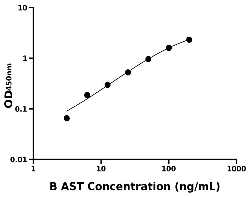 本试剂盒采用双抗体夹心法ELISA技术:将捕获抗体包被于酶标板上,捕获样品及标准品中的待测物AST,清洗后,再加入生物素标记的检测抗体进行孵育后清洗,形成“捕获抗体-抗原-检测抗体”免疫复合物,随后加入链霉亲和素偶联的辣根过氧化物酶进行孵育,待孵育结束后清洗,接着加入TMB显色后,若样本中有待测物则显蓝色,加入终止液停止反应。检测过程中游离的成分均被洗去,用酶标仪在450 nm处测OD值,颜色的深浅和样品中的待测物的含量呈正比,通过绘制标准曲线计算出样本中AST的浓度。