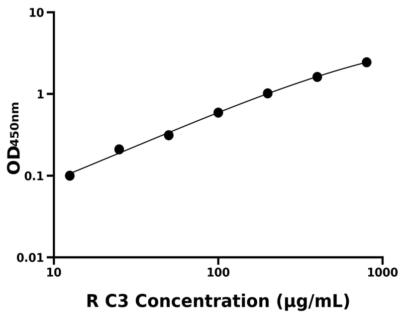 本试剂盒采用双抗体夹心法ELISA技术:将捕获抗体包被于酶标板上,捕获样品及标准品中的待测物C3,清洗后,再加入生物素标记的检测抗体进行孵育后清洗,形成“捕获抗体-抗原-检测抗体”免疫复合物,随后加入链霉亲和素偶联的辣根过氧化物酶进行孵育,待孵育结束后清洗,接着加入TMB显色后,若样本中有待测物则显蓝色,加入终止液停止反应。检测过程中游离的成分均被洗去,用酶标仪在450 nm处测OD值,颜色的深浅和样品中的待测物的含量呈正比,通过绘制标准曲线计算出样本中C3的浓度。